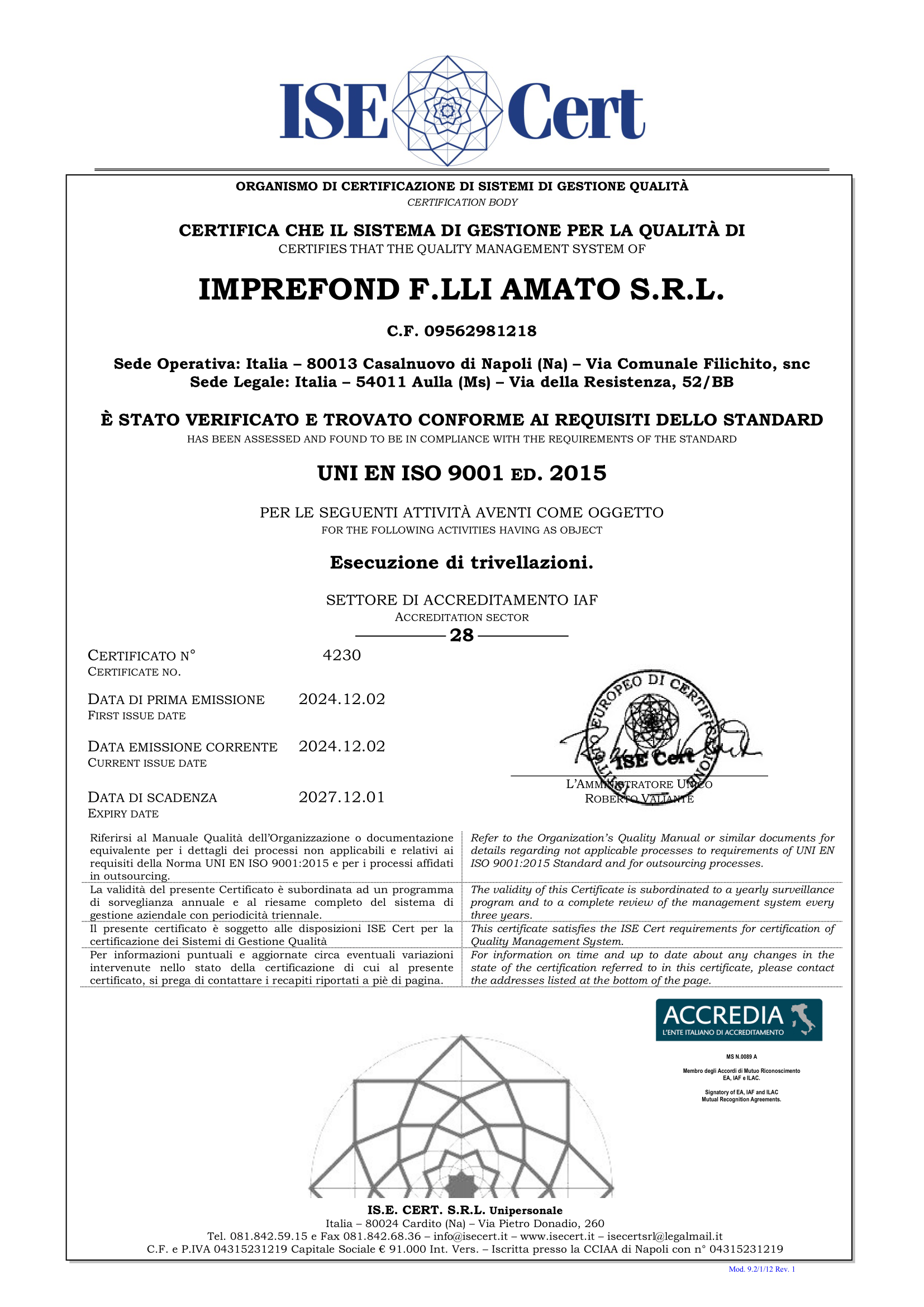 La certificazione, rilasciata da ISE Cert (organismo di certificazione di sistemi di gestione qualità) e accreditata nel settore IAF 28, copre l'esecuzione di trivellazioni. Il certificato n. 4230, emesso il 02.12.2024, è valido fino al 01.12.2027.