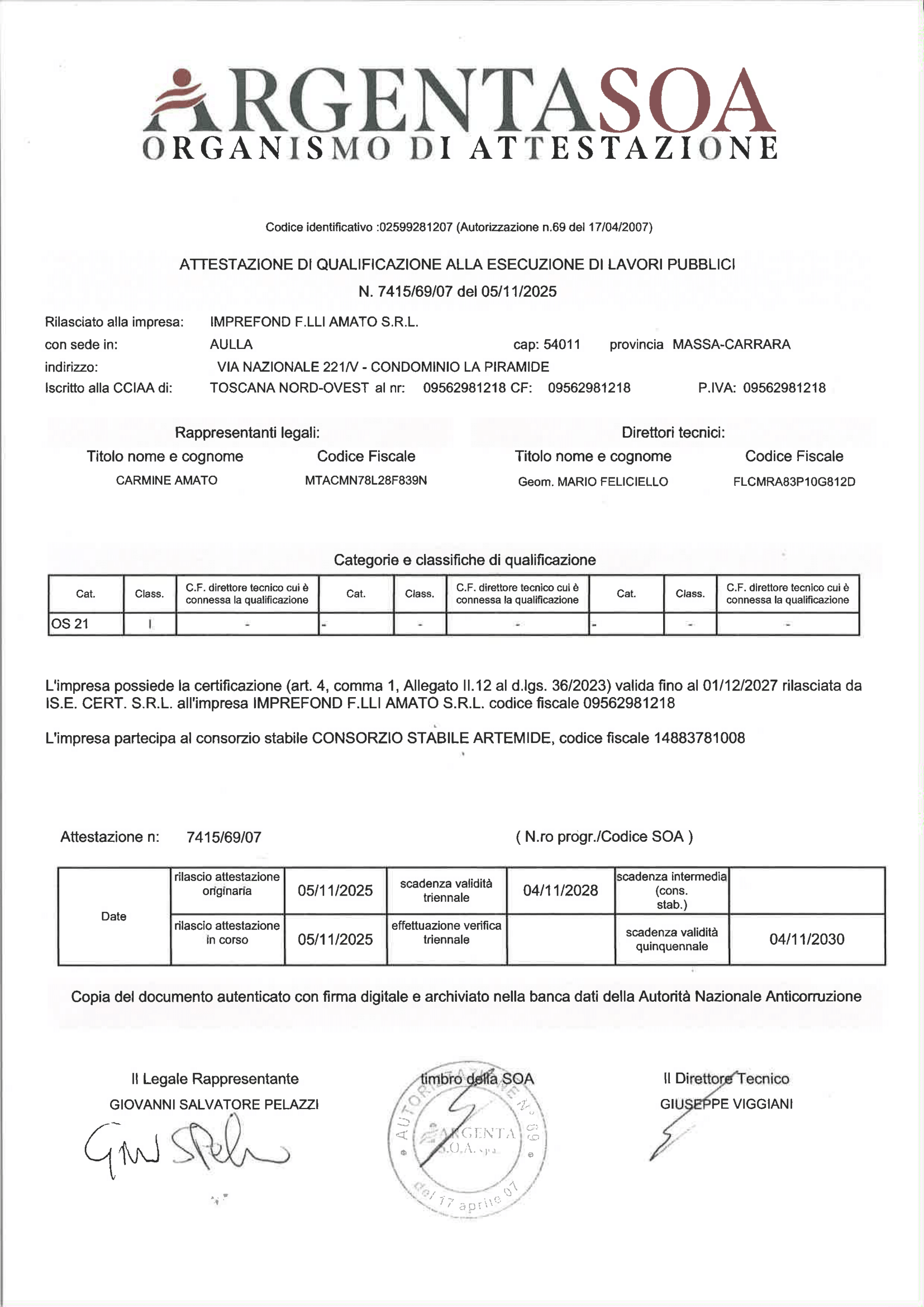 Imprefond F.lli Amato S.R.L. è certificata dall'organismo ARGENTASOA per l'attestazione di qualificazione all'esecuzione di lavori pubblici nella categoria OS 21, Classe I.